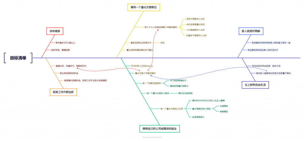 日常随想 自己的人生目标清单 王麦斯 • 2022年6月5日 • 发表评论 偷得半日闲,想着整理下自己的目标清单 一直以来总是在脑子里闪出各种想法,或者想维持现在的稳定,或者不甘心现在的庸碌 我想还是把想到的都写下来,一方面方便后面经常回顾,也利于更新维护 目前来说,请务必想一想拥有一个经过三年实盘验证的、年化100%、回撤20以内的策略,对自己到底意味着什么,请持续投入精力!